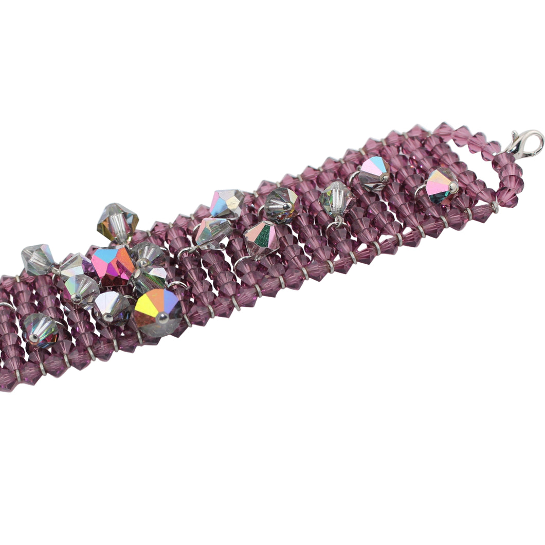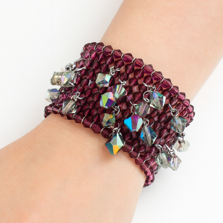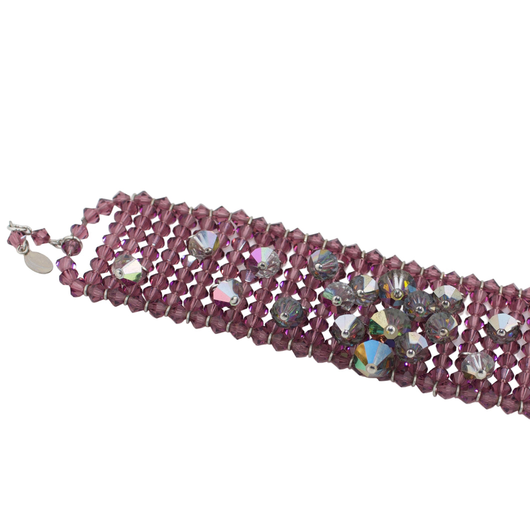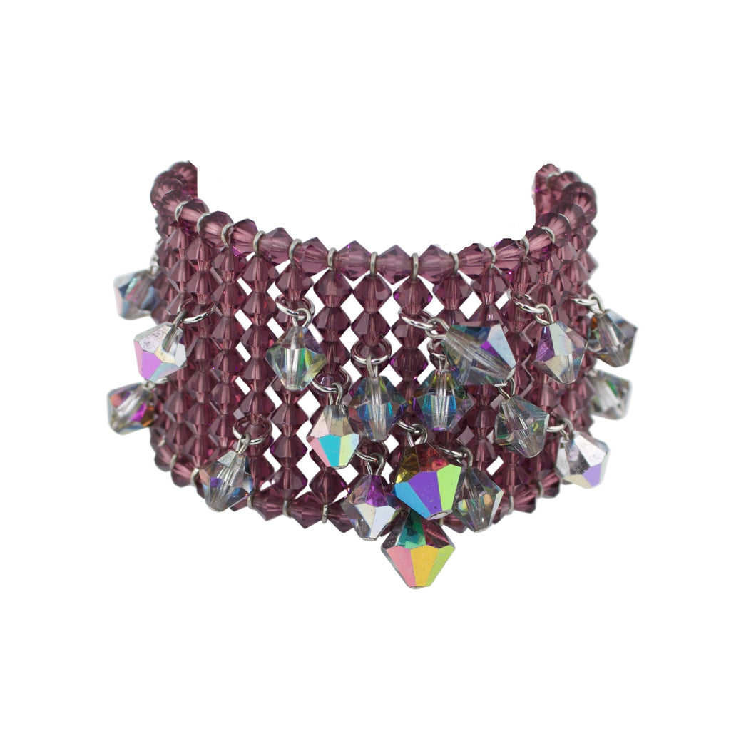 Bold yet elegant, this designer bracelet showcases a wide plum Preciosa crystal beaded band that radiates depth and sophistication. Iridescent faceted crystal accents dangle with light-catching brilliance, creating a playful shimmer that shifts through every color of the rainbow. Finished with a comfortable fit and crafted to be hypoallergenic, this piece makes a statement whether worn alone or paired with other sparkling accessories.