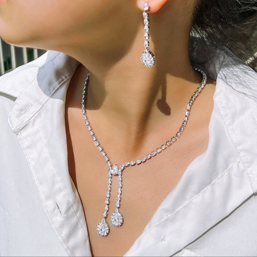 This glamorous set features a radiant necklace and matching earrings, both meticulously crafted with flawless cubic zirconia pave for a diamond-like brilliance. The necklace showcases a classic Y-drop silhouette adorned with teardrop stones, while the coordinating earrings mirror the same elegant design. Perfect for weddings, evening occasions, or any event where you want to make a dazzling statement, this set embodies refined luxury and timeless sophistication.
